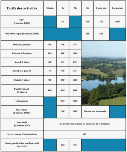 N’hésitez pas à contacter la base de loisirs pour tous renseignements (02.31.66.01.58 ou 07.68.30.64.89) et retrouvez les tarifs ci-dessous.